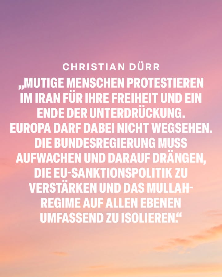 Mutige Frauen und Männer gehen im Iran für ihre Freiheit auf die Straße. Das Mullah-Regime reagiert wie immer – mit Gewalt. Wir sehen nicht weg. Die Bundesregierung muss ihr Schweigen beenden! Deutschland und Europa müssen jetzt handeln.